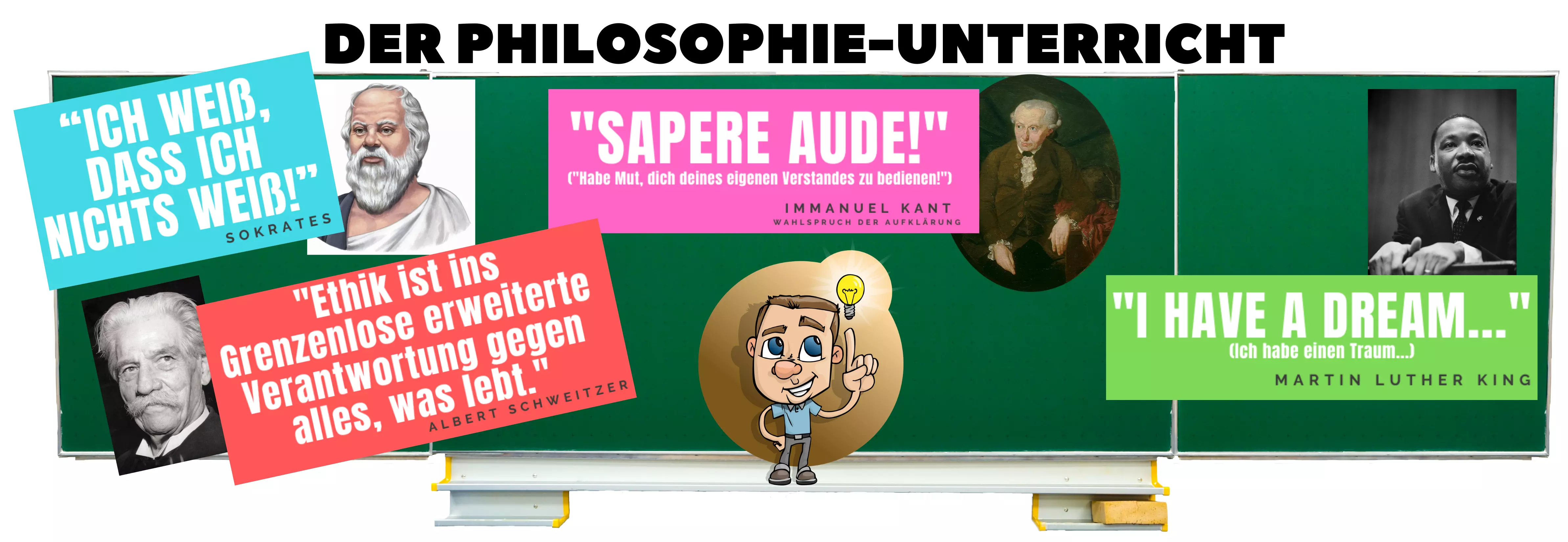 Der wohl prägendste und berühmteste Philosophie Immanuel Kant formulierte mit seinem Wahlspruch für die Aufklärung das, was Philosophieunterricht bewirken soll, er soll die Schülerinnen und Schüler in die Lage versetzen, dass sie den Mut entwickeln, sich ihres eigenen Verstandes zu bedienen – denn dieser Aspekt unterscheidet uns von allen anderen Lebewesen (4. Was ist der Mensch?). Gleichzeitig ist es unser Verstand, der es uns ermöglicht, über die Erkenntnistheorie (1.), die Ethik (2.), die Metaphysik (3.) und die Anthropologie (4.) nachzudenken – und genau dies soll der Philosophieunterricht ermöglichen.